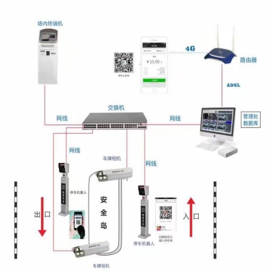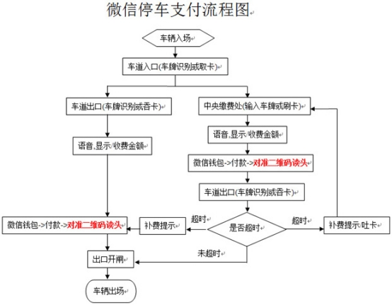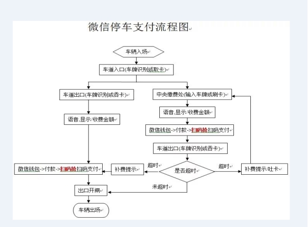出口接个停车机器人,就可以实现微信扫码支付出场,流程看下图;