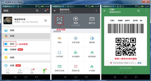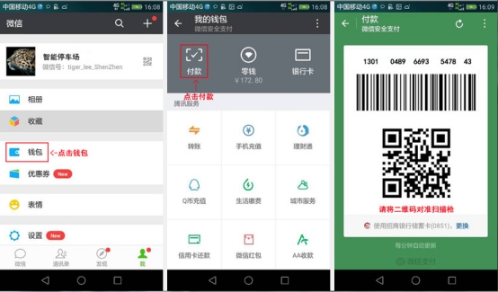 (微信扫码入场:打开微信>微信头像>二维码名片>对准读头来扫下即可>语音播报开闸入场)如下图所示:(微信支付:打开微信>钱包>付款>对准读头来扫下即可>提示付款成功)