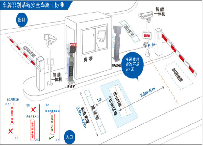 每个出入口架设一个高度为1.7-2.0米的摄像机立柱,立柱与道闸间隙距离一般不超过45CM安装车牌识别专用摄像机,摄像机镜头指向车道前方约4.0-5.5米的地面处对准车牌。