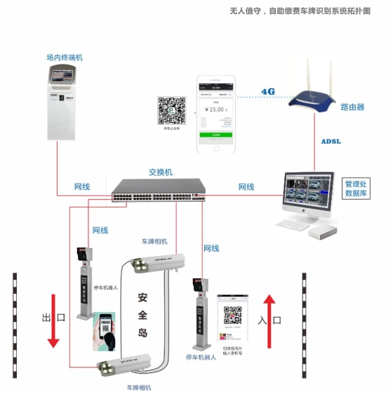 无人值守车牌识别原理:物业管理处工作人员网上注册公众号并开通支付功能后将账号输入到停车场管理软件,这样每笔停车费就即时到帐物业银行卡,资金无需经过第三方支付平台,车辆人口通过车牌识别或无牌车在入口停车机器人上输入手机号,或扫微信名片入场,出场取车前可以在场内终端机上自助缴费或关注车场公众号后车主在自己手机上缴费出场,也可以到出口让停车机器人扫车主手机付款二维码自动扣费开闸,如遇有设备故障或异常情况车主可通过出入口机器人上的对讲帮助按钮与管理人员手机远程微信对讲,远程处理异常、计费、开闸。这样我们就真正做到任何情况完全无人值守了。