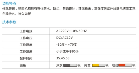 闸杆完成功能时间小于3秒,断电时可人工手动操作。合地感线圈,车辆过后自动落闸,具有防砸车功能。高效节能,低噪音,可于各种控制器设置联网实现智能控制。适应性高,闸杆长度可任意配备,闸杆起落开稳无颤动闸杆长度:1-6米,起杆时间:1-6秒,起降速度1-6档可选。