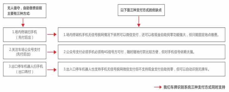 (2)支持微信、支付宝脱机脱网支付:微信、支付宝支付不需要下载APP,在手机没有网络,飞行模式的情况下也可以正常支付,整个支付过程不超过10秒钟,支付方便、简单快捷。可以支持三种支付方式:停车机器人扫码支付、场内终端机自助缴费、公众号关注支付。