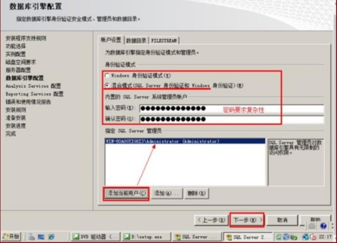 在这里,首先要配置服务器的服务帐户,也就是让操作系统用哪个帐户启动相应的服务。 为了省事,我们选择“对所有SQL Server服务使用相同的帐户”。