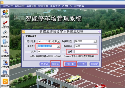 首次打开停车场软件需先创建一个数据库,输入您数据库电脑IP地址,数据库名,用户名,密码后点创建,然后软件会自动创建一个数据库。记得要点保存哟
